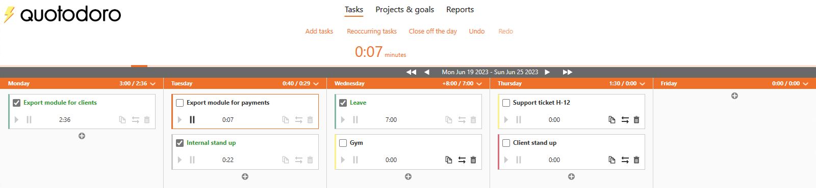 Quotodoro makes planning your week a breeze. Sophisticated features, like automatic rescheduling and reoccurring tasks, will save you precious time. Quotodoro's time tracking is exact and focused on real-life scenarios like unexpected interruptions.